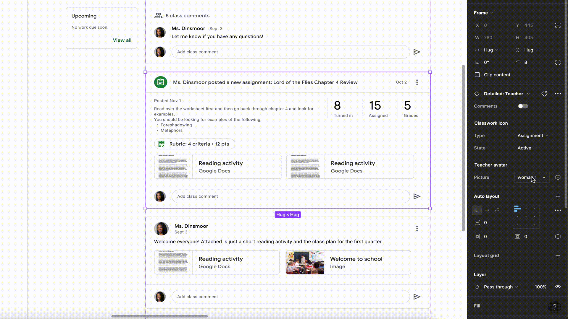 As I was going through to set the proper constraints, I was also able to adjust any Classroom-specific styles and components, ensuring all basic components, icons, colors, and text styles are linked to our Google Material Design file.